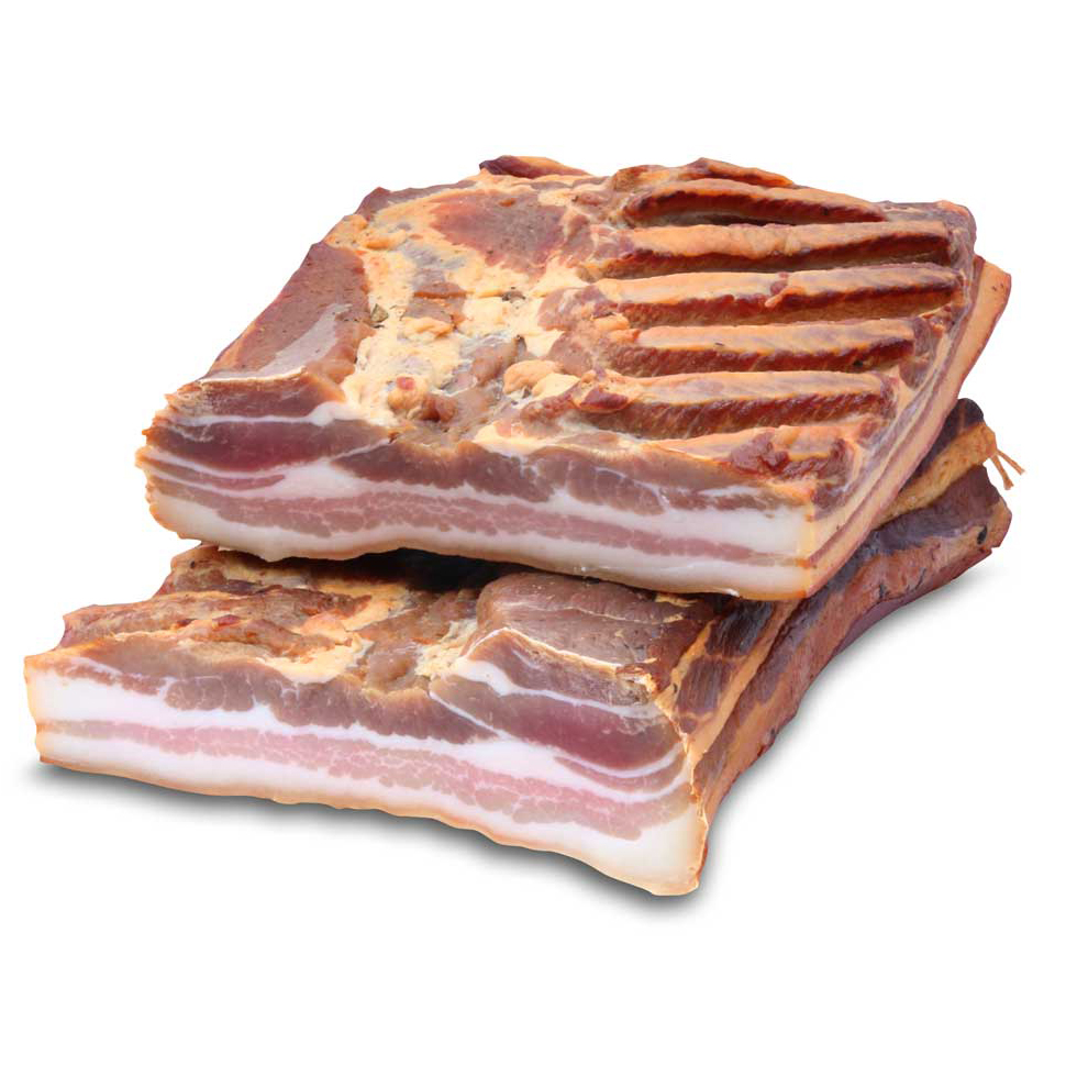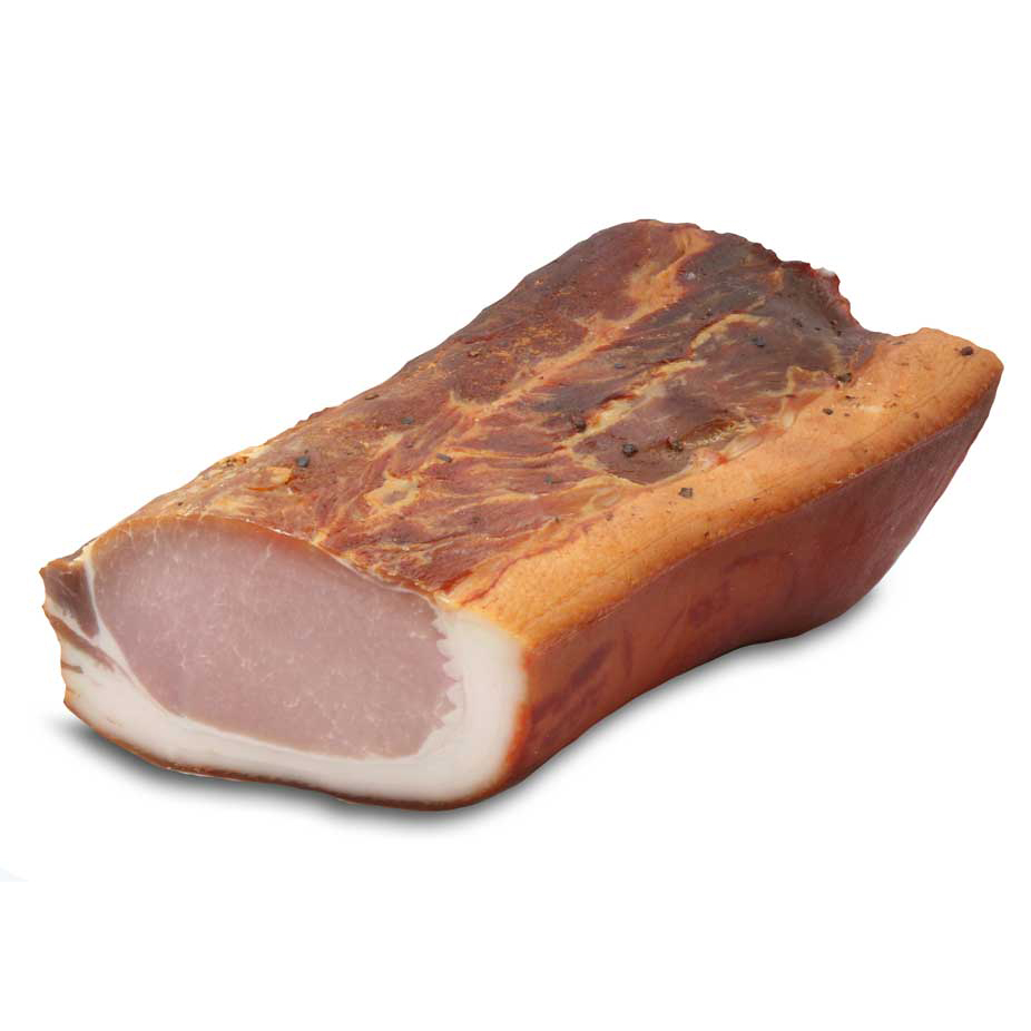 von unseren Schweinen, 3–4 Wochen handgesurt, dann über Buchenholzspänen geräuchert, Meersalz, Wacholder, Knoblauch, ohne Nitritpökelsalz