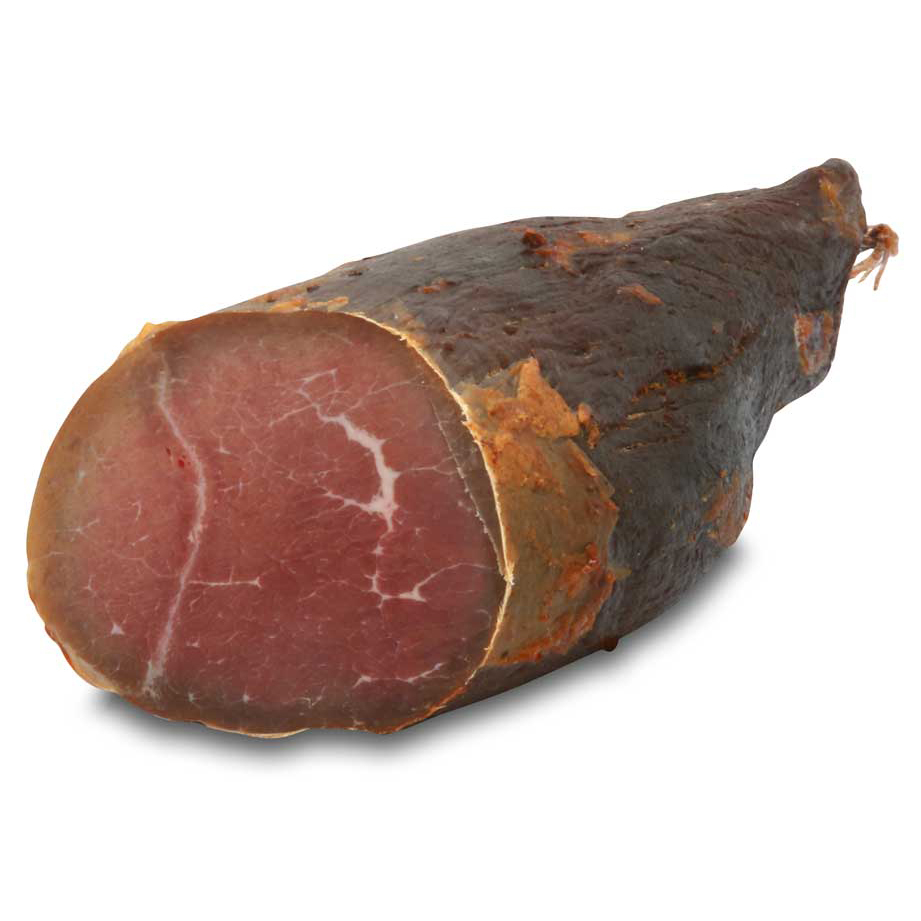 vom Angus-Rind, 3–4 Wochen handgesurt, dann über Buchenholzspänen geräuchert, Meersalz, Wacholder, Knoblauch, ohne Nitritpökelsalz